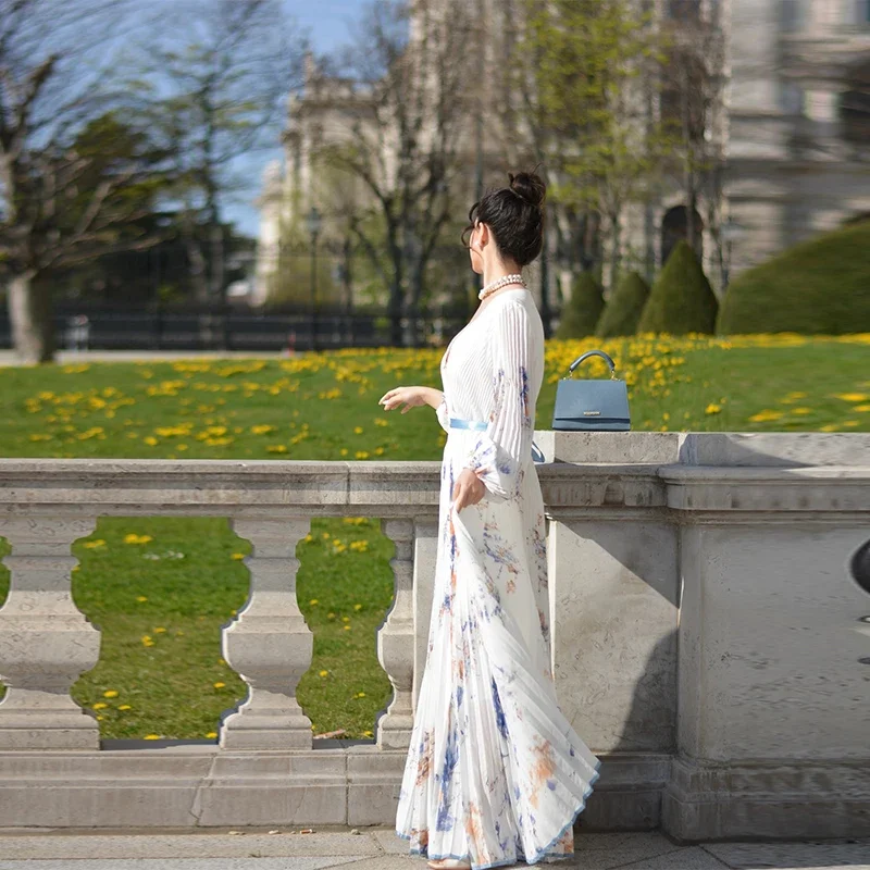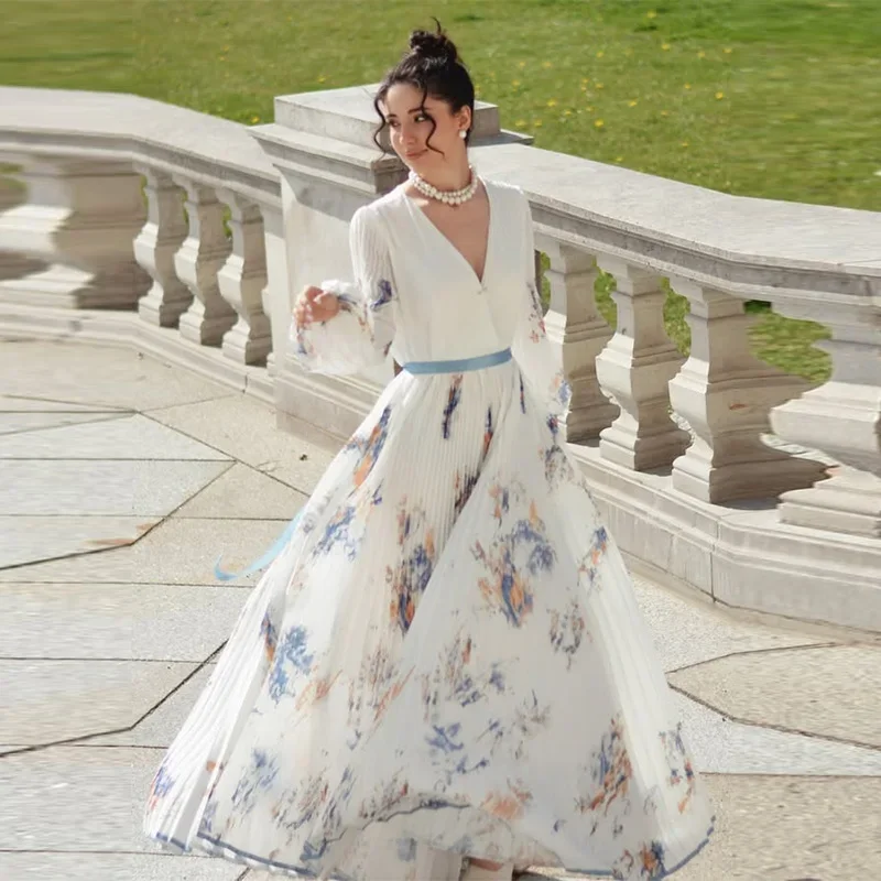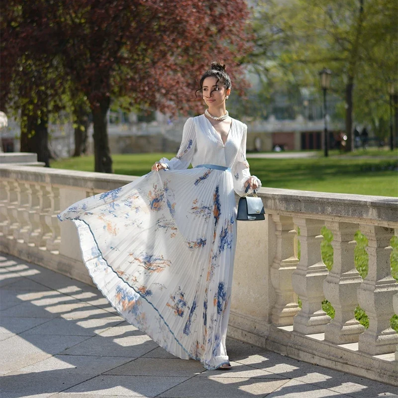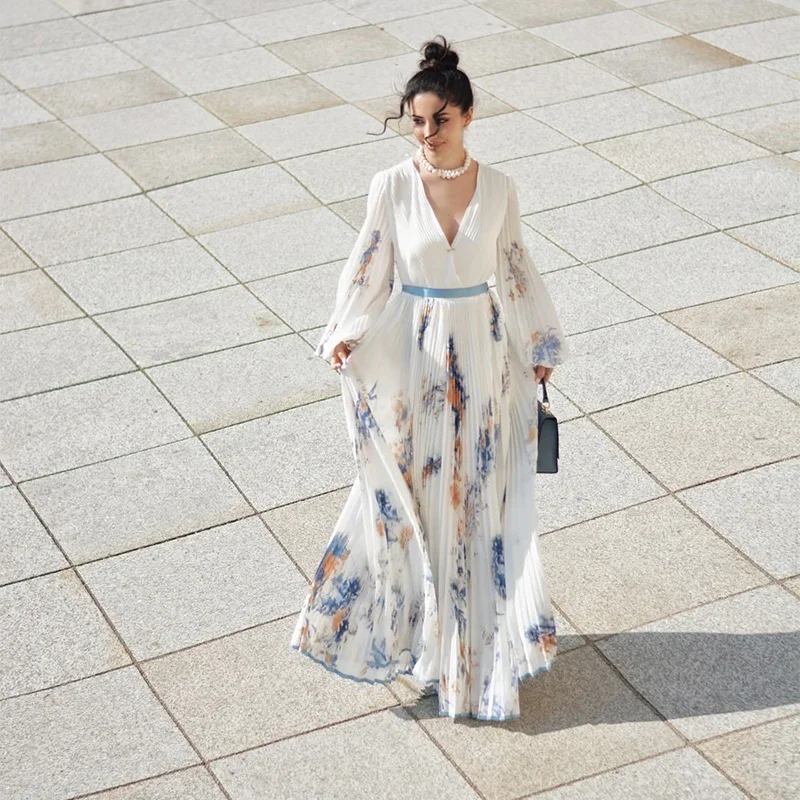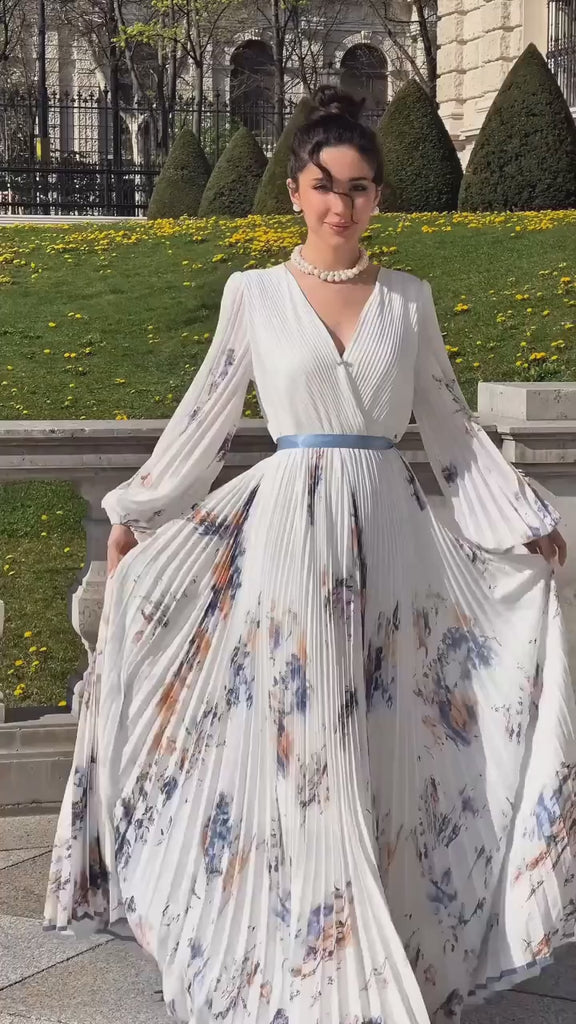 O design apresenta gola V elegante, cintura empire que valoriza a silhueta e uma modelagem A-line que combina fluidez e charme. O acabamento plissado com dobras delicadas traz movimento ao look, enquanto a estampa sofisticada adiciona um toque moderno e refinado.