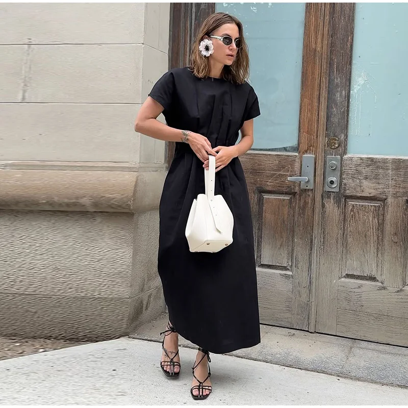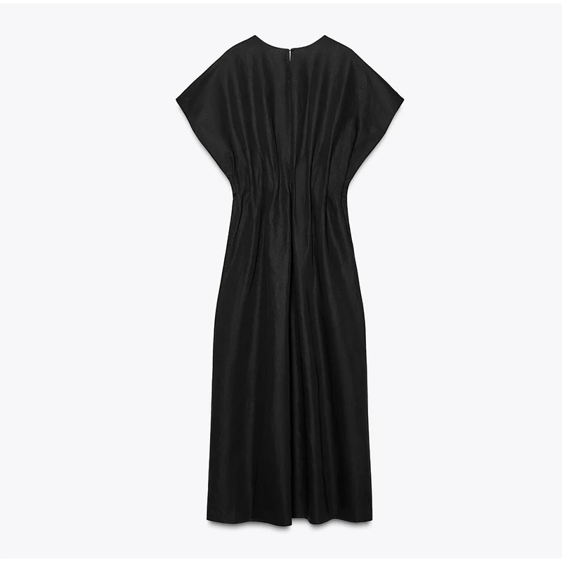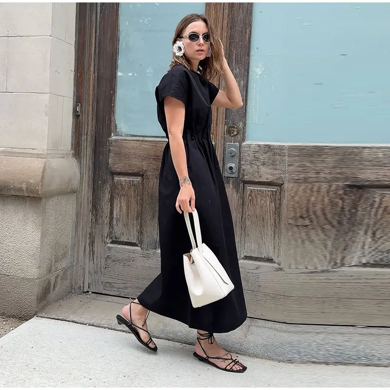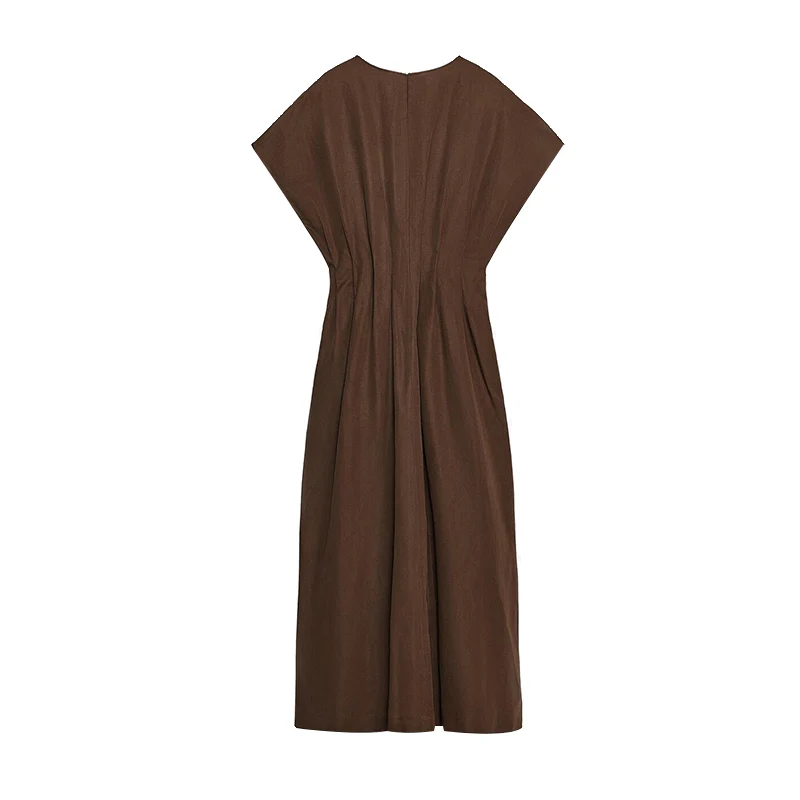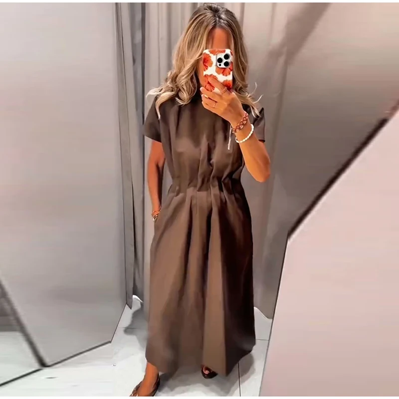 O vestido longo marrom feminino é a peça ideal para unir sofisticação e conforto em qualquer ocasião. Com mangas curtas e detalhe franzido na cintura, ele realça a silhueta de forma sutil e elegante.